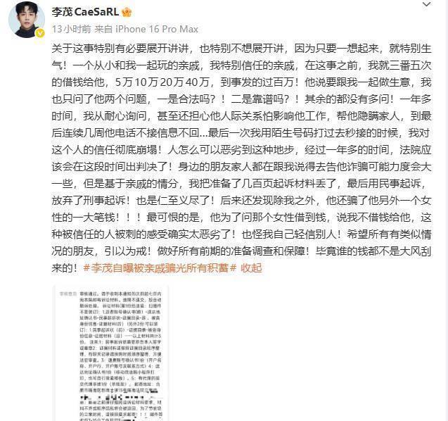 11日,李茂在社交媒体上发文回应了被骗一事,并晒出了法院立案的材料。他透露,虽然自己掌握了数百页的刑事诈骗证据,但因为亲戚情分,最后决定放弃刑事诉讼,改为提起民事诉讼。